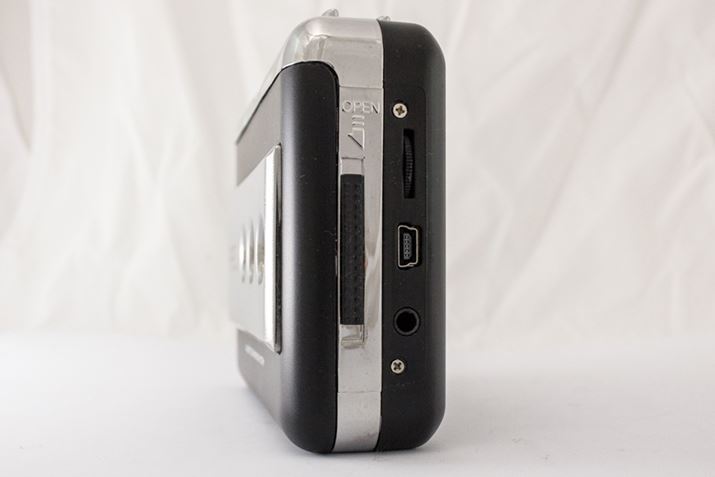 本体端子は、近年スマートフォンから「アイコス」にまで広く使われているmicroUSBではなく、最近ではあまりお目にかかることのなくなったmini-USBだ。ヘッドホン端子も付いているので、携帯カセットプレーヤーとしても使用可能