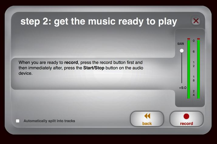「Tape Express」の「PLAY」ボタンを押すと、Macから音楽が流れ出し、右側のグリーンのインジケーターがチラチラ増減。これが録音レベルなので、適度なレベルに調整する。そして画面右下の「record」ボタンを押せば録音スタート。実に簡単だ