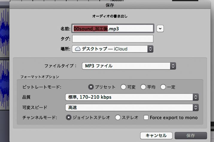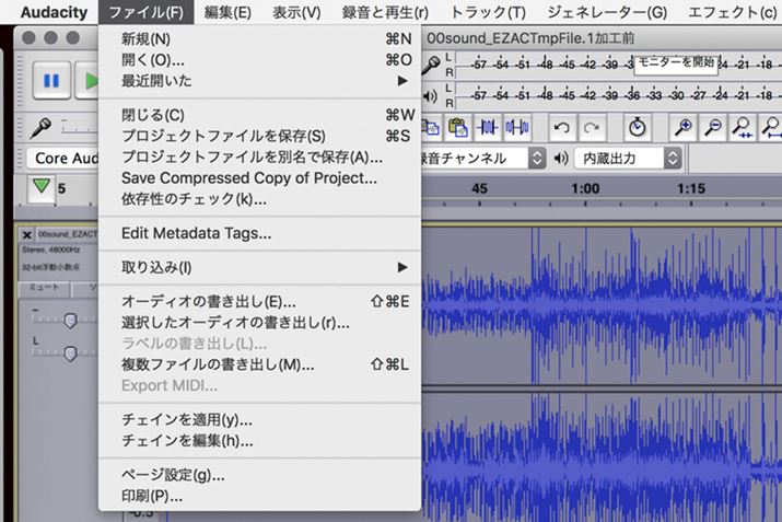 ノイズ除去が満足できるレベルに達したら、保存する。Audacityの拡張子はaupのプロジェクトファイルだが、あとでもう一度編集するのでなければ、そのまま「オーディオの書き出し」でMP3ファイルを書き出してもいい。