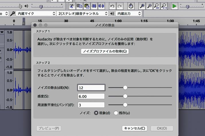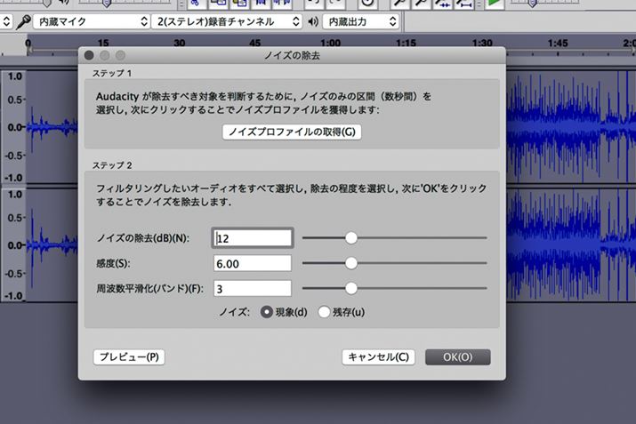 「ノイズ除去」などというとややこしい感じがするが、操作はいたって単純だ。「ノイズはこれだ」とAudacityに認識させ、それを削除するように指示を出すだけでいい。