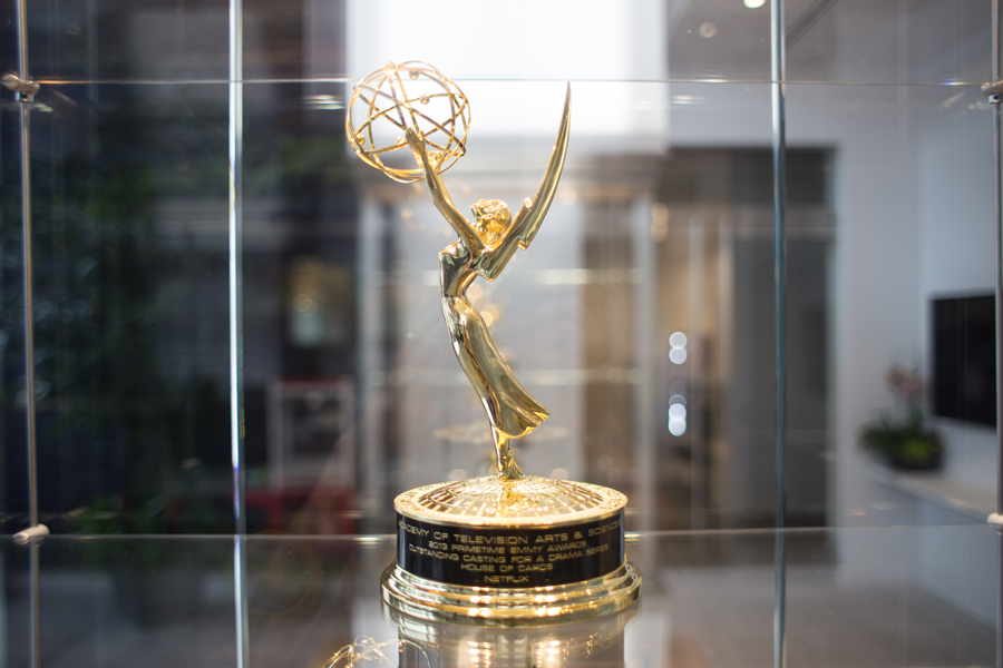 本社エントランスにはNetflixの映像技術に対する貢献を称えるトロフィーが多数飾られている