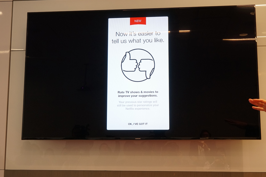 Netflixには視聴した作品を5つ星でレーティングする機能もあるが、数週間後にはこのレーティング機能もリニューアルされ、親指上下の「いいね!」風のデザインに変更されることも初公開された。同時にユニークな機能として、Netflixのアルゴリズムへのマッチング率を55〜100%マッチというようにユーザーも確認できる仕組みになる。