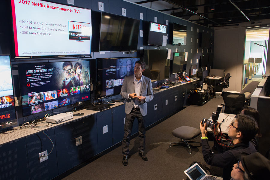 Netflixを視聴できる機種は、スマートフォン、タブレット、ゲーム機などさまざまあるが、特に薄型テレビには「Netflix RECOMMENDED TV」という基準も設けられており、その検証もすべてロスガトスのNetflix本社で行われている。