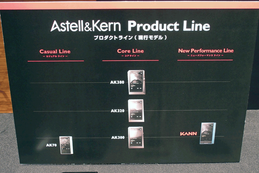 ちなみに、同社はこれまで、「AK380」「AK320」「AK300」といったハイエンドなポータブルオーディオ層に向けたCore Lineと、「AK70」が属するポータブルオーディオのエントリー層に向けたCasual Lineの2つの製品ラインを展開していたが、今回発表されたKANNは、これら2つのラインとは異なる新ライン「New Performance Line」で展開される。