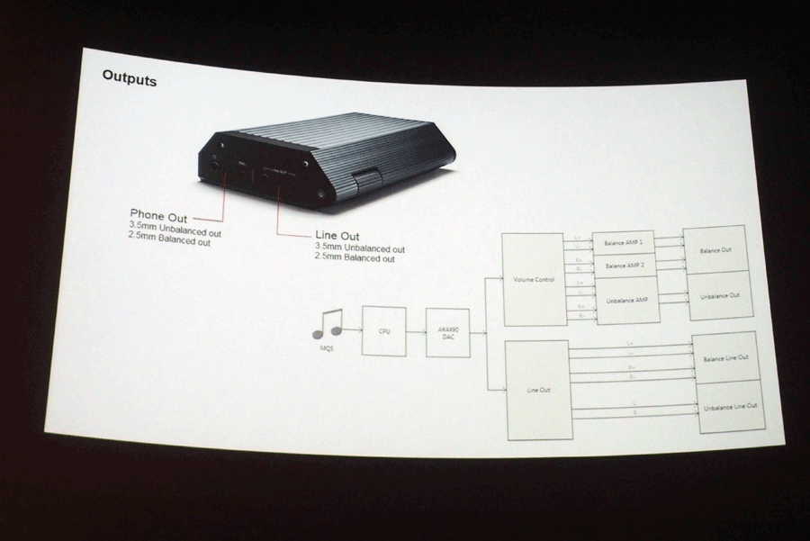 また、アナログ出力部分では、ヘッドホン出力とは別にライン出力を搭載している点もユニークなポイントだ。ヘッドホン出力とは、出力部分だけでなく回路も完全に独立しているということで、これまでよりも純度の高いライン信号を取り出せるという。こちらも、ヘッドホン出力同様に、3.5mmアンバランスと2.5mmバランスの2系統の出力を用意。アンバランス出力は、接続する機器にあわせて0.7V、1V、1.25V、2Vrmsの4段階で出力を設定できるという。