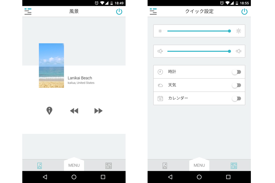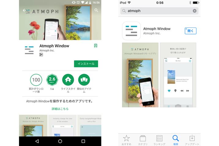 「Atmoph Window」のセットアップおよび操作は専用アプリから行う。iOS(9.0以上)とAndroid(4.4以上)向けに配信されており、将来的には「Apple Watch」にも配信予定。セットアップはアプリの指示に沿うだけで、数分で完了した