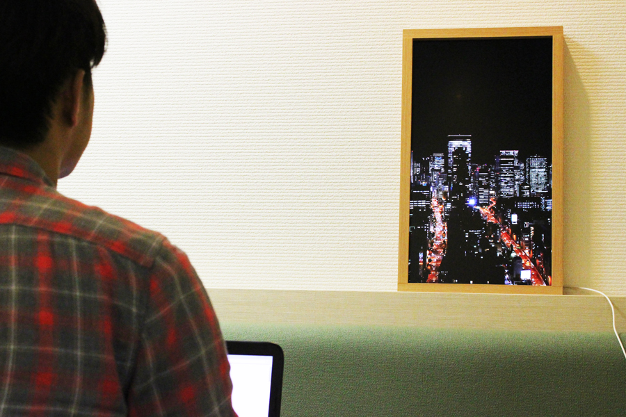 「Atmoph Window」がテレビやモニターと異なるもうひとつの点がフレーム。テレビやモニターには、スタンドとフレームが搭載されていて、ボタンが付いていたりメーカーのロゴなどが入っていたりする。いっぽうで、「Atmoph Window」は窓以外の要素を可能なかぎり排除し、液晶にフレームがついているだけ。このシンプルなデザインは、家電ではなくどちらかというとインテリアのようで、見たときにテレビやモニターとは異なる印象を受けるのだ。