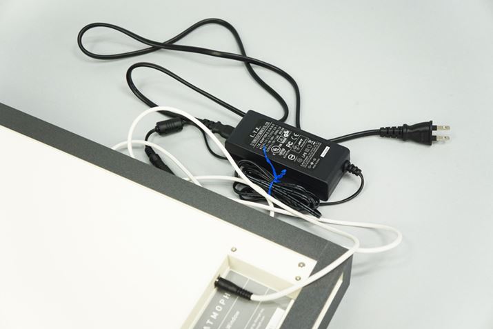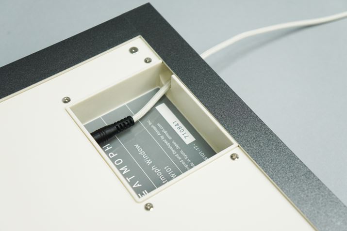 本体下部には電源コードを通すための穴が付いていて、壁にかけて使用するときに電源コードがじゃまにならないように工夫されている。海外のクラウドファンディングで入手した製品の中には荒削りな設計のものがあるが、「Atmoph Window」は京都のスタートアップが開発した製品で、かゆいところに手が届くような気配りが随所に見られる
