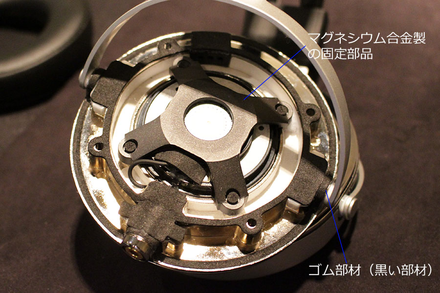 ドライバーユニット内部。金属パーツが多く使われているのが印象的で、樹脂パーツはすくない
