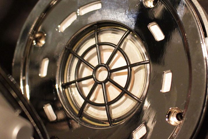 格子の後ろに見える白いのがセルロースナノファイバーの振動板。振動板とフレームをつなげる黒っぽく見えるエッジ部にはクッション性の高いエラストマー素材を使い共振を防いでいる。なお、ベース部のホール数で2つ並んでいるところがあるが、最終仕様ではそこがひとつにまとめられている