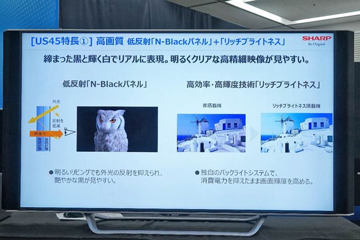 「AQUOS US45ライン」の画質面での大きな特徴となっているのが、独自の低反射技術「N-Blackパネル」の採用だ。テレビは画面サイズが大きくなるほど外光反射が多くなる。明るいリビングで使用する場合も、この「N-Blackパネル」の採用により、光の反射による映り込みを抑え、見やすさと艶やかな黒表現を両立しているのだ。