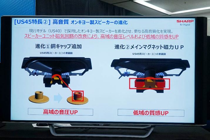 「AQUOS US45ライン」には、オンキヨーと共同開発のスピーカーユニットを搭載。従来モデルに比べ、さらなる高音質化を図っているという
