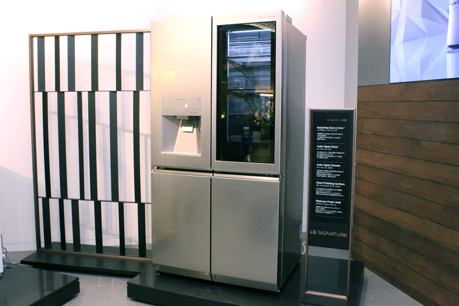 上述の2層式洗濯機に続き、展示を見た女性層からの支持が圧倒的に多いというのが、この冷蔵庫。LGの高級ブランド「シグニチャー」の製品で、マジックミラーになっているドアをコンコンと2回ノックすると、庫内のライトが自動点灯して、ドアを開けなくても中身が見えるようになる製品だ。また、冷蔵庫の前を通ると足下に「DOOR OPEN」という光の文字が投射され、それを足で踏むことでドアを自動オープンさせられる機能も搭載する。