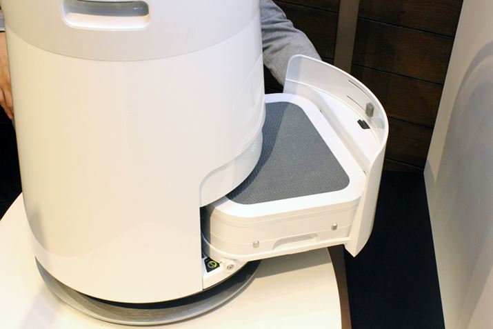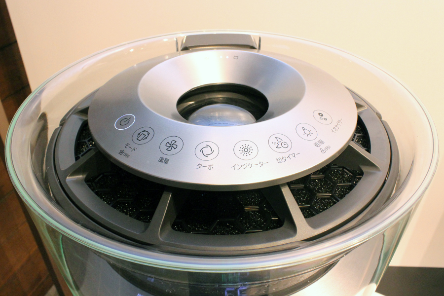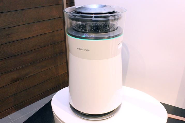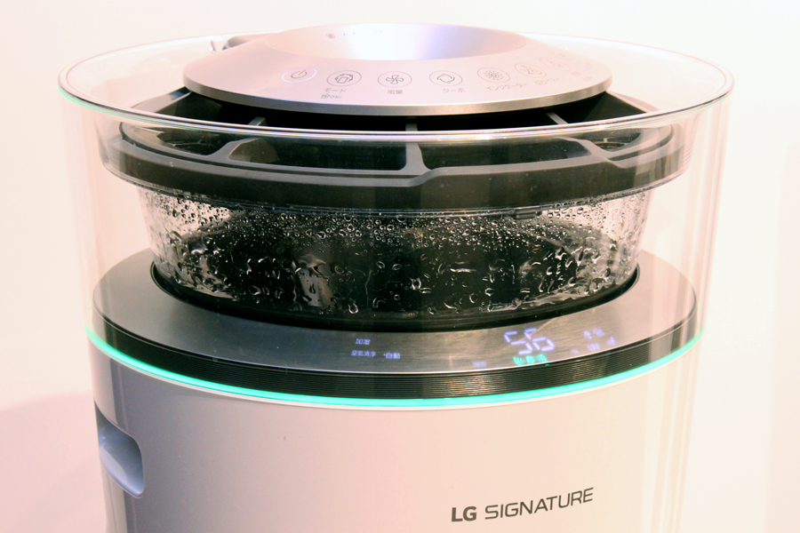 最後の製品は、水を使う“ウォータリング・システム”搭載の空気清浄機。内部には2つのフィルターを搭載している。本体下部360°方向から空気を吸い込み、それを1つ目のフィルターを通した後、さらに水を含めた2枚目のフィルターでもう1度キレイにしてから放出するという仕組みになっている。本製品に関しては、「本体が大きくて設置しづらそう」という声が多いようだが、水が動くビジュアルイメージや、色が変わるインジケーターなど、スタイリッシュなデザインに関して好反応が得られているそうだ。