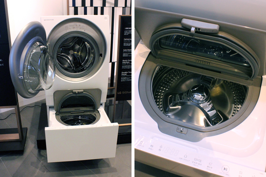 今回の展示を見た主婦層からの評判が高いのが、ドラム式の洗濯層と縦型の洗濯層を両方備えた「ツインウォッシュ」という2層式の洗濯機。それぞれの洗濯層に洗濯物を入れて、同時に稼動させられる。主婦層からの人気の理由は、2層式ならではの“分け洗い”がしやすいことだ。