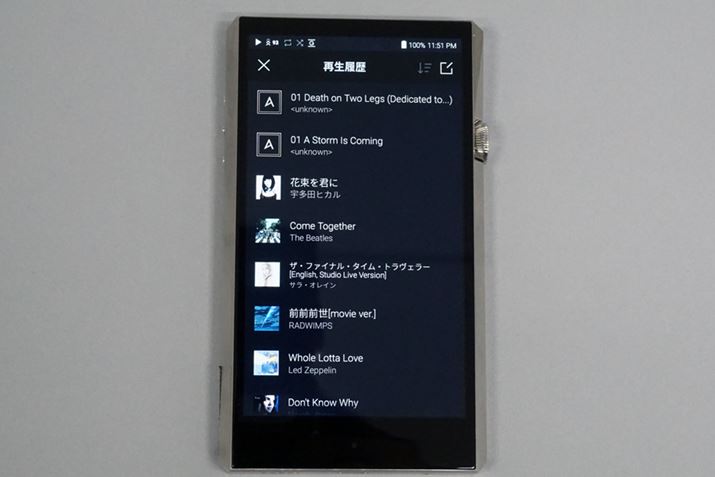 下からスワイプすると現れる再生履歴画面。ソート切り替えで、再生順だけでなく、再生回数順での表示も行える