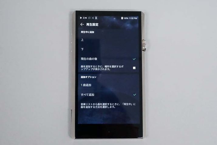 また、個人的に非常に便利に感じたのが、設定メニューの中にある再生設定の機能。再生リストに楽曲を追加する際に、追加する位置をリストの一番上、一番下、現在再生中の楽曲の後の3種類の項目から選択できたり、追加する楽曲をファイル単位かアルバム単位のどちらの単位で追加するかといったことがあらかじめ細かく設定することができるのだ。DAPの機能の中でも、再生リストは使用頻度のかなり高い機能。いままでのAK380の再生リスト機能も悪くなかったが、こういったかゆいところに手が届くような機能が新しく用意されたのはうれしい限りだ。