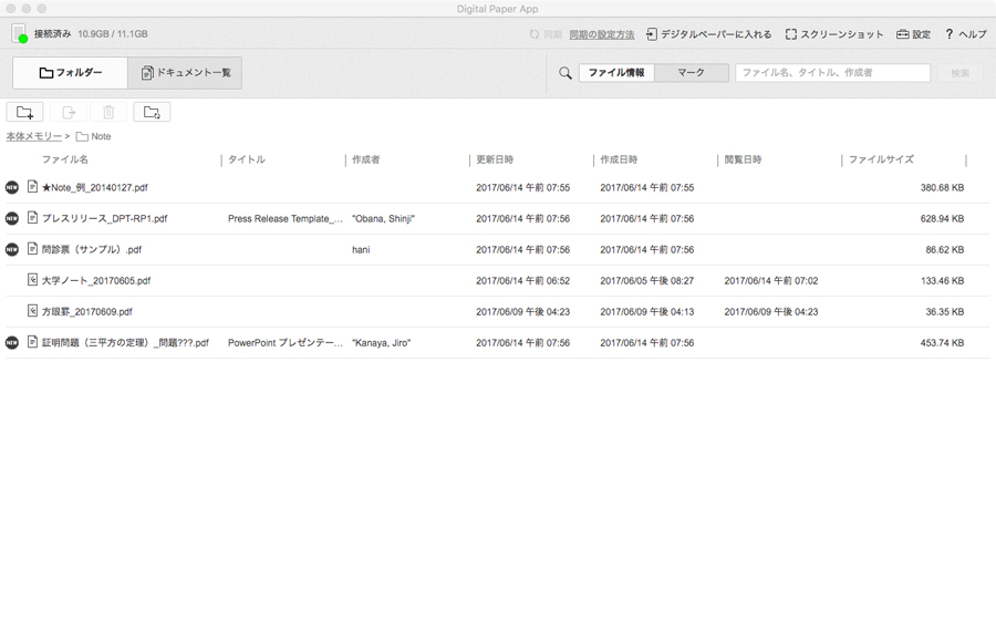 Mac版の専用ソフト「Digital Paper App」の画面。ここにPDFファイルを入れれば、「DPT-RP1」と同期が取れる。PC内の特定フォルダーを同期フォルダーとして設定することも可能だ