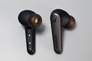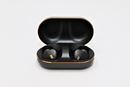 また、充電ケースのデザインもユニークだ。外側はエコレザーまたはファブリックを採用しており、完全ワイヤレスイヤホンを収める充電ケースとは思えない高級感がある。イヤホンの取り出しがとても楽で、ケース、イヤホンそれぞれの充電状況がふたを開けなくてもわかるところも便利だ。
