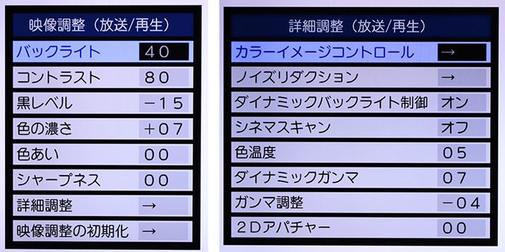 バックライトの明るさやコントラストなどの調整が可能(左)。内蔵チューナー、HDMI1、HDMI2はさらに詳細な画質調整が行える(右)