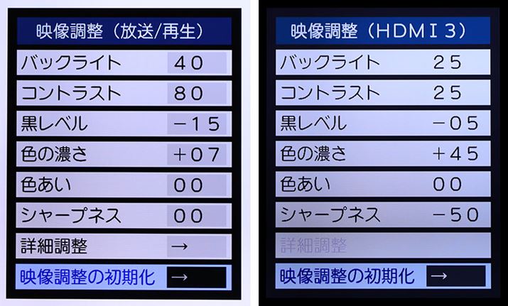 左が内蔵チューナー、右がHDMI3の初期値。いずれも映像モードは「標準」。HDMI3は4K映像の入力を意識したチューニングになっているようだ
