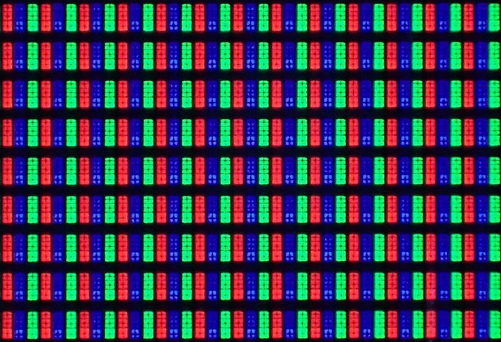 パネルの画素をマクロレンズで撮影した画像。VAパネルなので、サブピクセルの構成はRGB(赤緑青)にW(白)を加えたRGBW方式ではなく、RGB のサブピクセルが並ぶRGB方式となっている