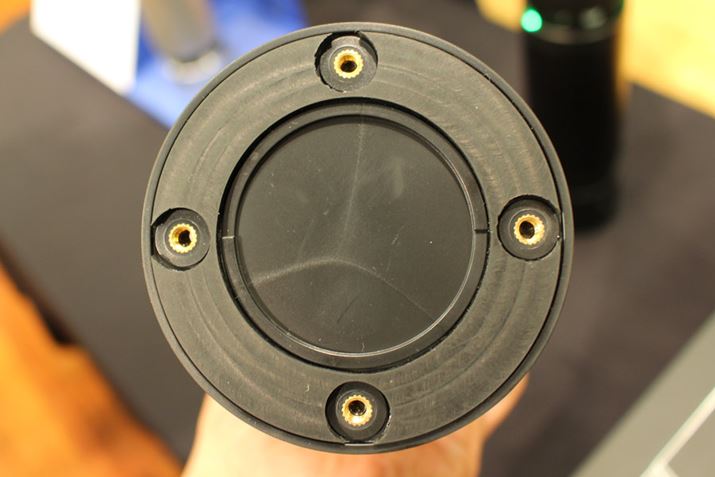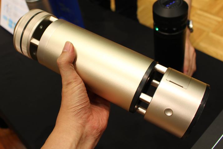 円筒形のシルエットがユニークなHintのボディ。重さは1kgくらいで、手にするとちょうどワインのボトルくらいの重量感を感じる。なお、写真はクラウドファウンディング専用色のシャンパンゴールド