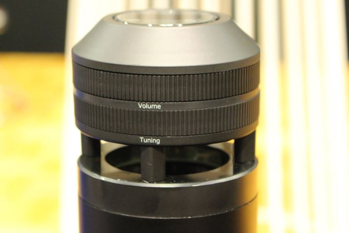 ボディ上部には、ボリューム調節とチューニング用のダイヤルが配置される。その下の空間部分には、演出用のLEDと、中音域を担当するスコーカーが配置される