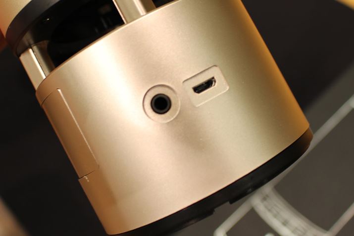 こちらもボディ下部。左に見えるのはヘッドホン端子、その隣はバッテリーの充電に使うmicroUSBポート。内蔵バッテリーは、約5時間の充電で約3時間の連続再生が行える