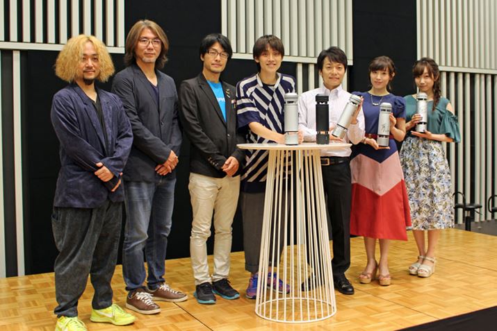 左から、Hintのデザインを行ったメチクロ氏、グッドスマイルカンパニーの安藝貴範社長、Cerevoの岩佐琢磨代表取締役、本製品の立ち上げ役でニッポン放送アナウンサー吉田尚記氏、ゲストとして、声優の野島健児さん、中村繪里子さん、田所あずささんが登場