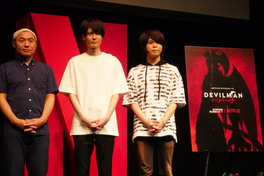 永井豪氏原作で幾度となくアニメ化、実写化されたあの「デビルマン」のNetflixオリジナル作品「DEVILMAN crybaby」。2018年初春にNetflixが全10話を独占配信。監督は「夜明け告げるルーのうた」で2017年アヌシー国際アニメーション映画祭長編部門クリスタル賞(最高賞)を受賞した湯浅政明氏。脚本は「コードギアス 反逆のルルーシュ」で知られる大河内一楼氏が手がける。主人公・不動明は内山昴輝さん、親友の飛鳥了は村瀬歩さんが声を担当。会場には湯浅監督、内山さん、村瀬さんが駆けつけ、会場を大いに盛り上げた。