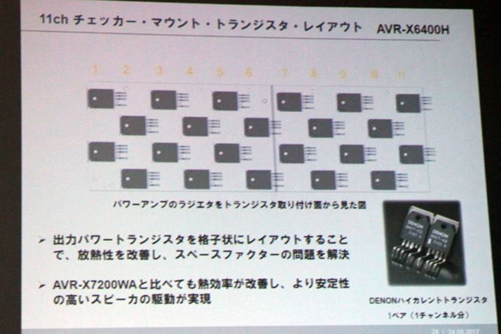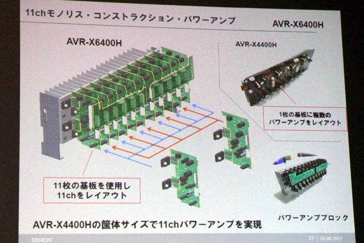 いっぽう、細かい内部構成は2機種でグレードが異なっている。AVR-X6400Hは上位モデルとして、チャンネルごとにパワーアンプ回路を個別の基板に独立させた11chの「モノリス・コンストラクション・パワーアンプ」構造を採用。これによってチャンネル間の影響やクロストークを抑え、チャンネルセパレーションを高めているのが特徴だ。ヒートシンクには共振の少ないアルミ押し出し材を使用する。
