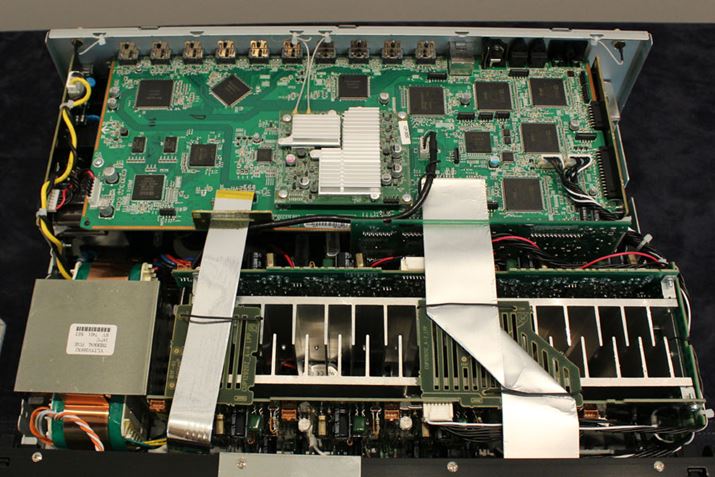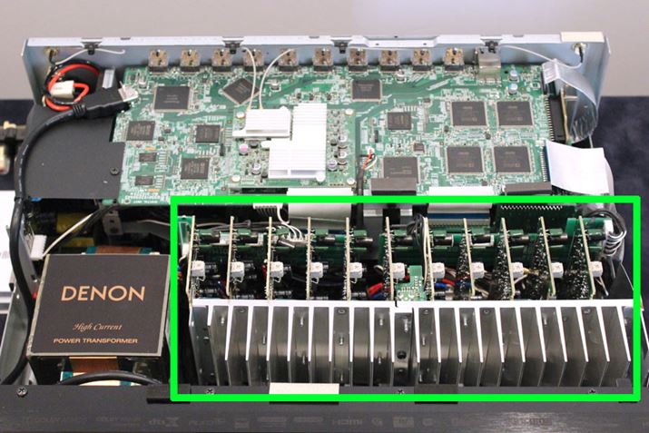 AVR-X4400Hのほうも、全チャンネル同一構成のディスクリート・パワーアンプで構築するなど徹底的に音質優先の設計を採用。2枚の基板に分けた9chアンプを搭載するほか、効率的な放熱を目指し、不要振動を抑えている。また、DCサーボ回路には大容量コンデンサーを使用している。