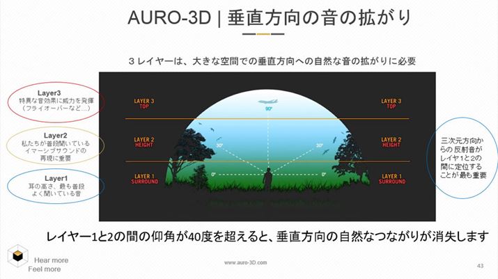 横方向のサラウンドだけではなく、高さ方向の音場再現を高めるという考え方はDolby AtmosやDTS:Xと同じだが、Auro-3Dは高さ方向の音場をファーストレイヤー、セカンドレイヤー、サードレイヤーと規定している。ファーストレイヤーが通常の5.1ch、セカンドレイヤーがフロントとリアのハイトスピーカー(合計4ch)、サードレイヤーがトップサラウンドスピーカーの1chで、それぞれのチャンネルから作り出される音場を“レイヤー”と呼称している
