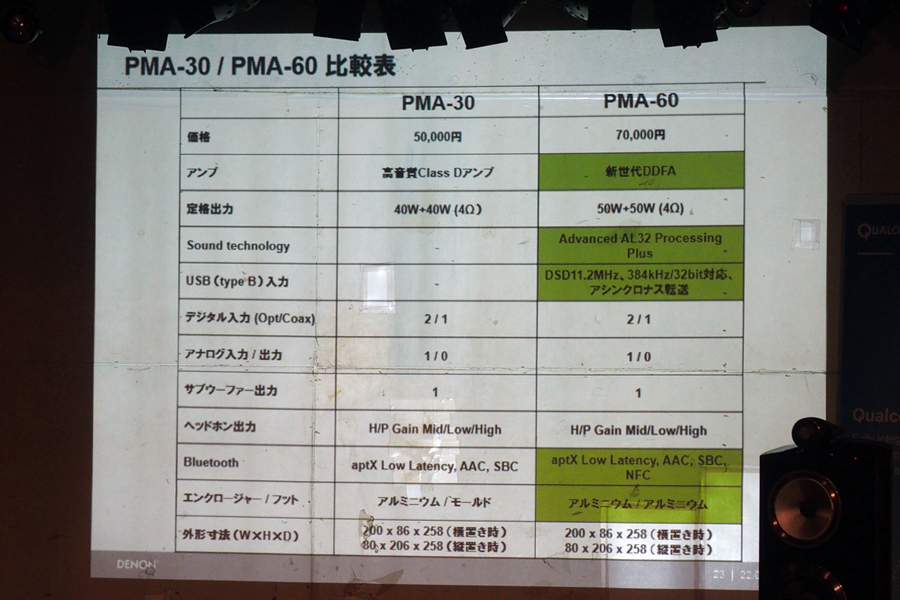 PMA-60とPMA-30の主な仕様。緑になっているのが両機種の差分だ
