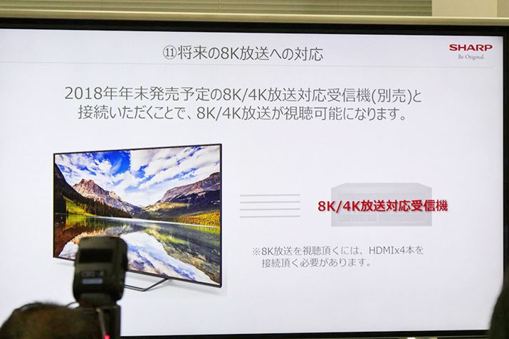 今回発表された「LC-70X500」は、先に発売された法人向け(BtoB)モデル「LV-85001」「LV-7002」とは異なり、世界初の家庭用8K対応液晶テレビとなる。TVチューナーは、地上/BS/110°CSデジタルに対応するチューナーを3基搭載。2018年12月開始予定の8K実用放送に合わせて発売予定という「8K/4K放送対応受信機」(別売)を組み合わせることで、8K実用放送の視聴にも対応する。
