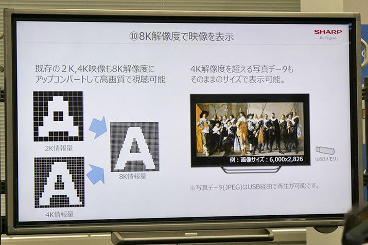 液晶パネルには、グループ会社の堺ディスプレイプロダクト(SDP)製の、約3300万画素(7680×4320画素)高性能8Kパネルを採用。液晶テレビ「AQUOS」で培った、2K/4K映像の8Kアップコンバート技術のほか、映像信号の光源に応じて輝度を復元する「メガコントラスト(ダイナミックレンジ拡張技術)」や、自然で豊かな発色を再現する広色域技術「リッチカラーテクノロジープロ」を搭載。また、HDR規格にも対応しており、PQ方式はもちろん、HLG(ハイブリッドログガンマ)もサポートした。これらにより、現在放送されているフルHDなどのテレビ番組をはじめ、さまざまな2K/4K映像コンテンツも高精細・広色域・高輝度で楽しめるという。