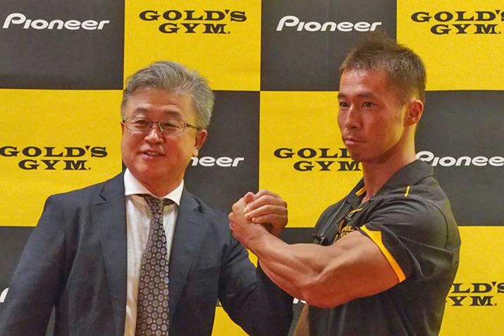 発表会に登壇したオンキヨー&パイオニアイノベーションズ代表取締役社長の宮城謙二氏と、ゴールドジムを運営するTHINKフィットネス フィットネスプロダクツ事業部の佐藤貴規氏