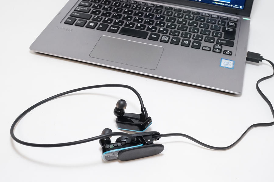 本器はPCにつないで充電や楽曲のやりとりをします。メーカーによれば、1回の充電で連続して約10時間の稼働が可能とのこと。メモリーは8GBですので、エクササイズ用の音源を入れておくには十分な容量だと思います。