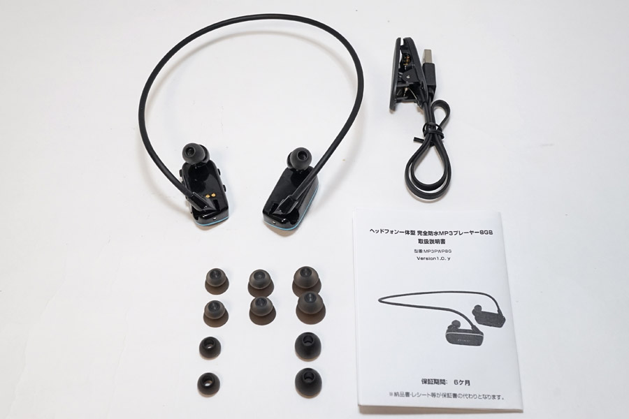 内包物は、本体、充電ケーブル、イヤーピース6セット、取扱説明書です。Mサイズのイヤーピースが本体に装着されています
