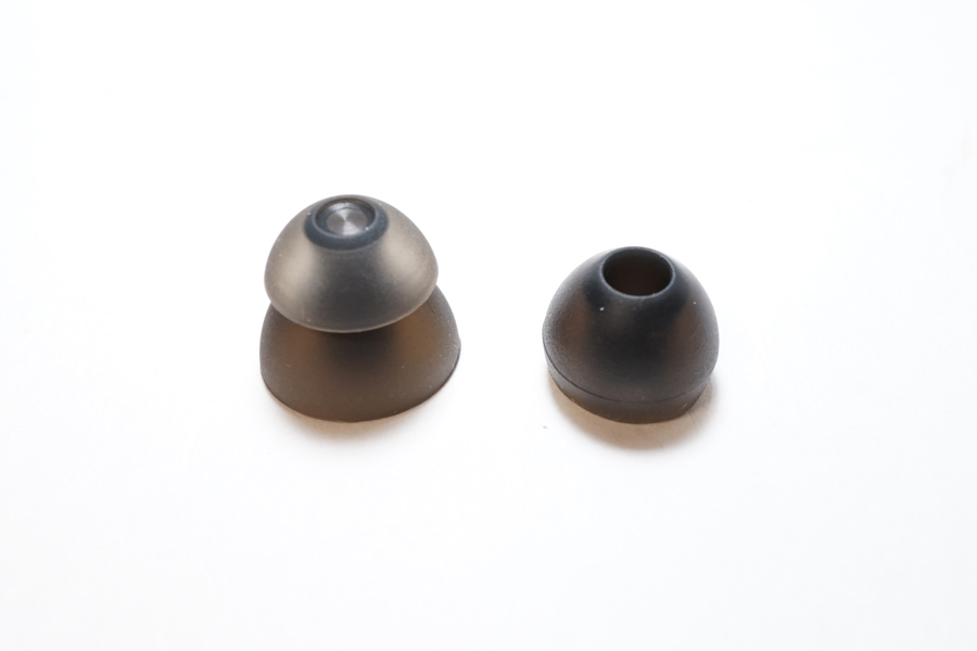 付属するイヤーピースは、防水タイプ(左)と通常タイプ(右)がそれぞれS、M、Lの3サイズあり、合計で6セット付属します