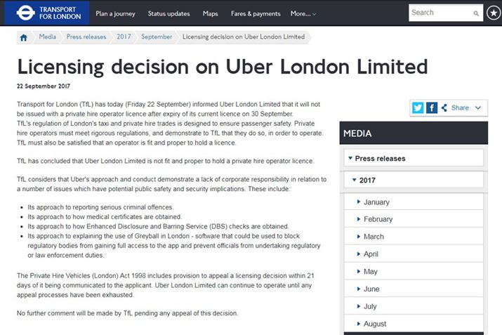 ロンドン交通局は声明で「Uberがハイヤー事業の免許を受けるのに適さない」と結論付けたことを明らかにしました。その理由は“重大犯罪の報告を怠ったこと”“健康診断取得方法の説明”“運転手の犯罪歴や経歴調査方法の説明”“「Greyball」の使用”の4つにあると言います。