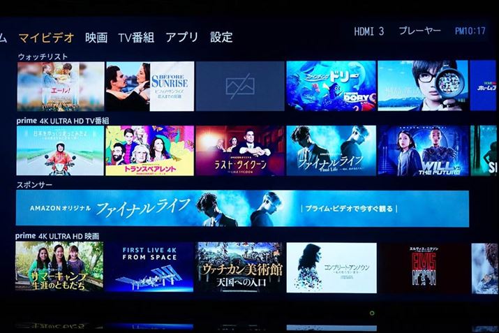 新Fire TVのグラフィックユーザーインターフェイスは、他のFire TVシリーズでも使われている共通のデザインのものが採用されている。「ホーム」の画面には最初から「プライム・ビデオ」の作品が並んでおり、プライム・ビデオのヘビーユーザーにはかなりありがたい。もちろん、4K解像度対応のデバイスということで、グラフィックユーザーインターフェイスもしっかりと4K解像度となっている。