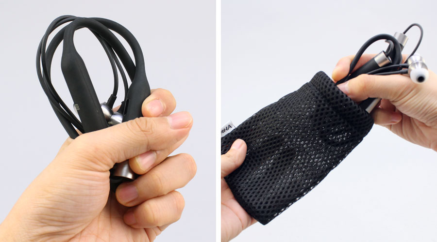 IPX4相当の防滴防汗仕様で、ランニングなどちょっとした運動時にも使用できるようになっている。さらにネック部はフレキシブルに曲げられるので、小さくまとめてキャリングポーチの中に入れて持ち運び可能