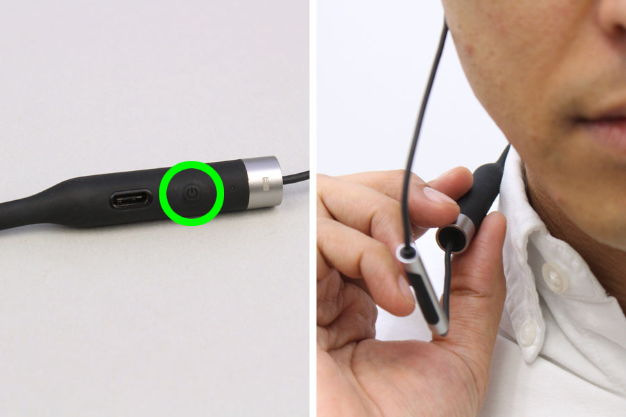 右側ケーブルに備える電源を入れると、自動でBluetooth機能もONになる仕組み。バッテリーの駆動時間は約12時間。Bluetoothによる音声入力が5分間なかった場合、自動で電源オフになるオートパワーセーブ機能にも対応している