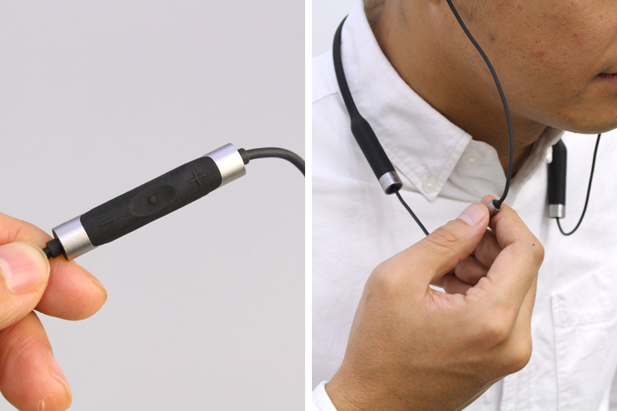 右側のケーブル部にリモコンを装備。一時停止、曲送り/戻し、音量調整が行える。マイクも内蔵しており、スマホとの接続時にはハンズフリー通話も可能