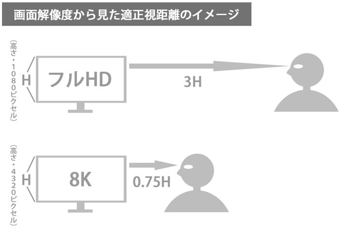 元々、フルHD(2K)映像の適正視距離は、画面の高さの3倍(3H)とされてきた。これは、視力1.0の人間が、フルHD(2K)映像の画素のツブツブを知覚しないでキレイに見ることができる距離ということ。8Kの画素サイズはフルHD(2K)の4分の1。単純計算で3H÷4=0.75Hなので、8K映像の適正視距離は、画面の高さの0.75倍(0.75H)の距離になる。たとえば、8Kテレビの画面サイズを100インチ(16:9)と仮定した場合、画面の高さは約120cmなので、最小限の適正視距離はその0.75倍の90cmと計算できる
