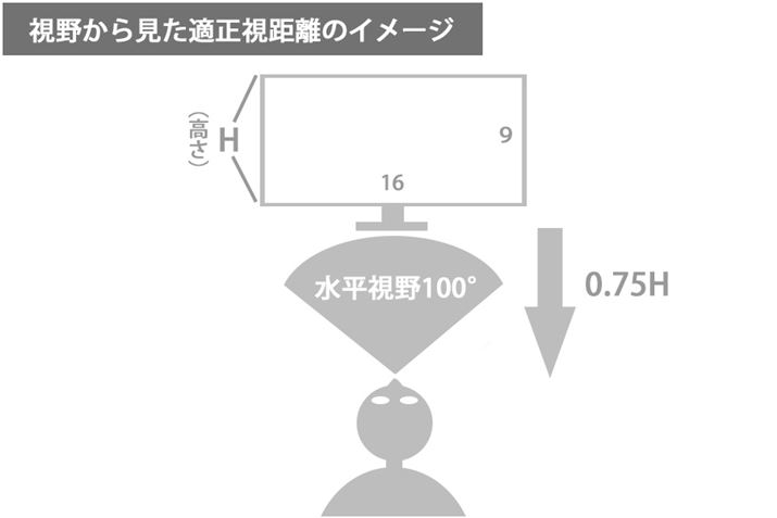 実は、映像サイズが視野の水平100°を上回ると、人間が映像から得られる臨場感は飽和する(=最大限に近いところに達する)という結果が、NHK技研の研究でわかっている。まず、この水平視野100°で映像を見るときの適正距離が、画面の高さの0.75倍(0.75H)の距離であるとされている。その0.75Hの距離で、視力1.0の人が画素の粗さを知覚せずスムーズに映像視聴するためには、映像の水平画素数を約8,000にする必要があることがわかり、ここから「8K」という解像度が導き出されたという経緯がある。