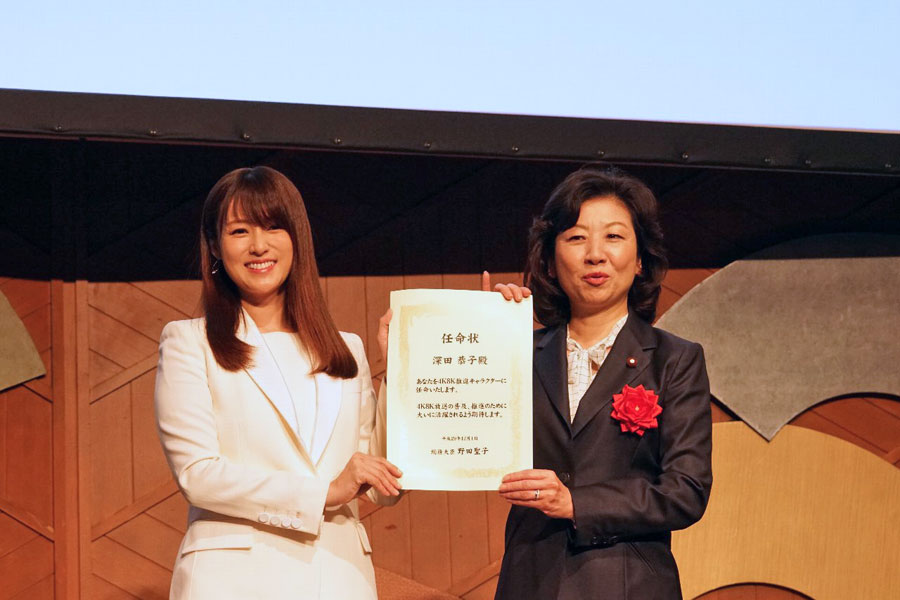 「4K8K推進キャラクター」に任命された女優の深田恭子さんに、野田聖子総務大臣から任命状が手渡された。