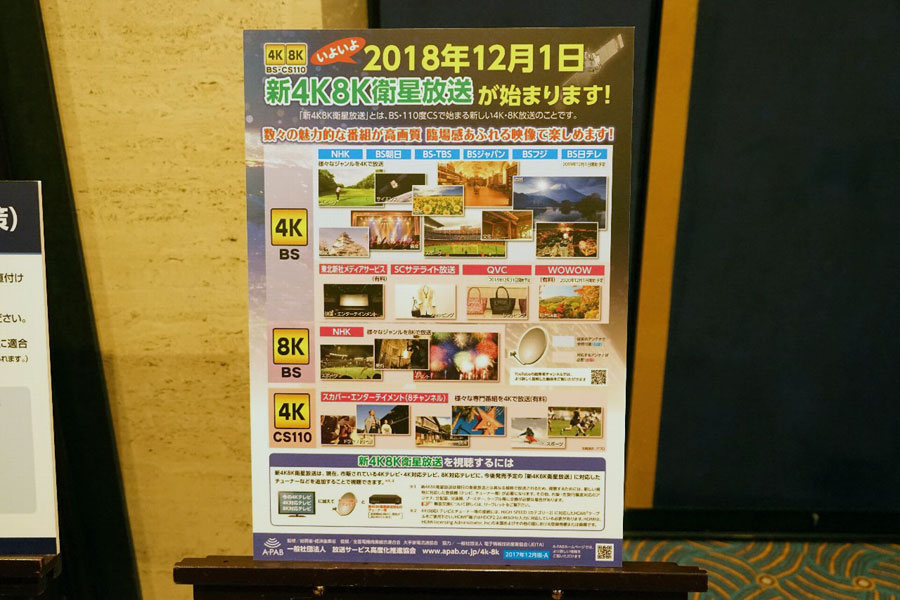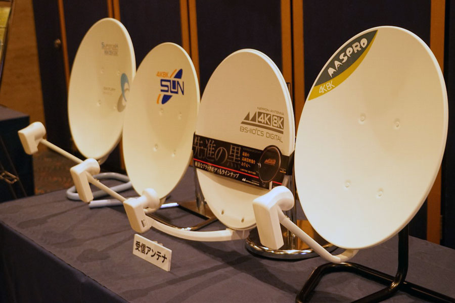 会場には日本のテレビセットメーカー各社のブースも出展され、12月1日に発売となったシャープの8Kテレビ「AQUOS LC-70X500」を始め、各社4Kテレビも展示されていた。セレモニーのなかでも改めて語られた内容だが、現在発売されている4K/8Kテレビでは受信できないが、来年半ば以降にチューナーの発売が予定されている。一部チャンネルは左旋に対応したアンテナも必要だが、こちらはすでにアンテナメーカーから発売中とのこと。来年12月1日というスケジュールの目標に向け、各社がまさに歩みを進めている段階と言えそうだ。